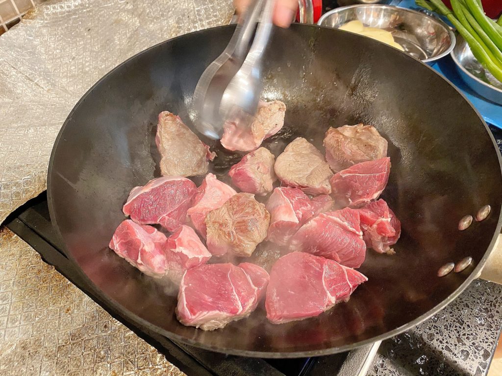 Sear the beef chunks until the outside is browned.
