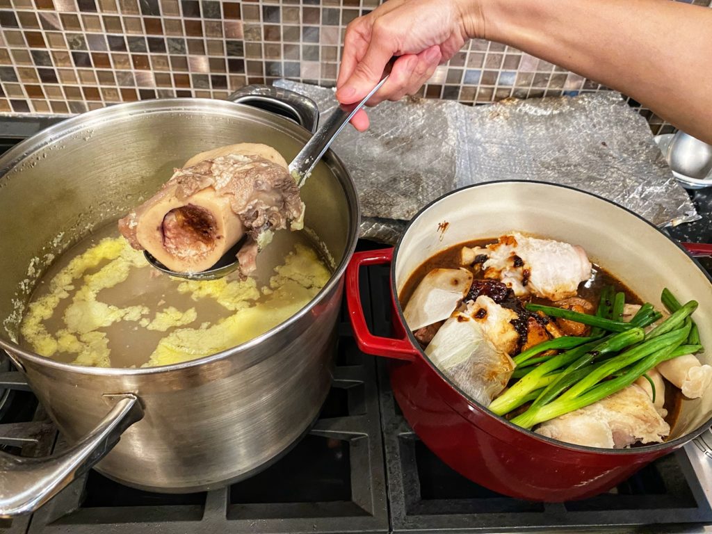 11. Serve in a bowl with 3/5 bone broth and 2/5 meat broth – mix to taste. Garnish with any extra green onions.