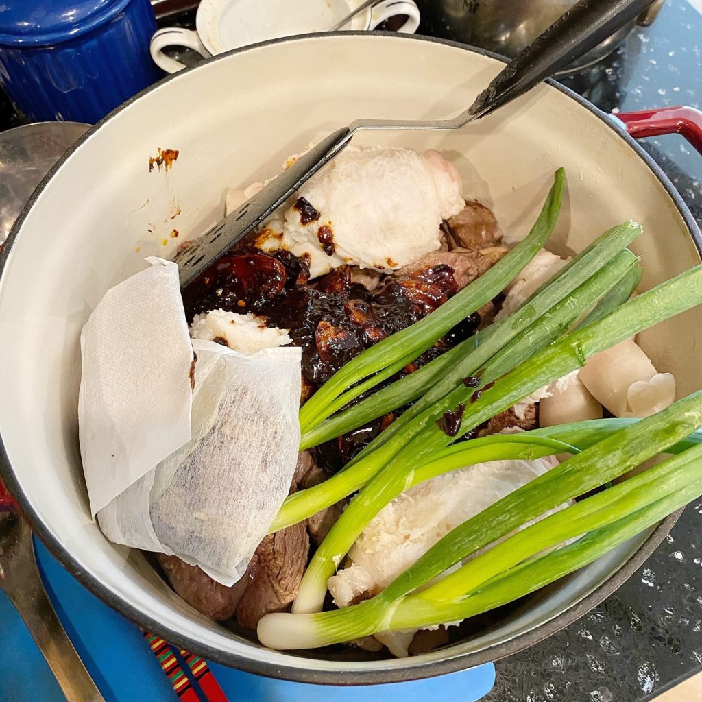6. Once cooked, add this to the Dutch oven, along with whole green onions, spice bag, and 2 quarts of water.