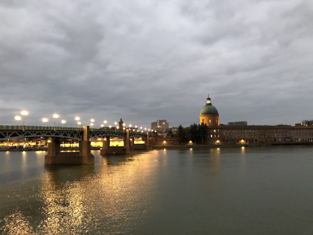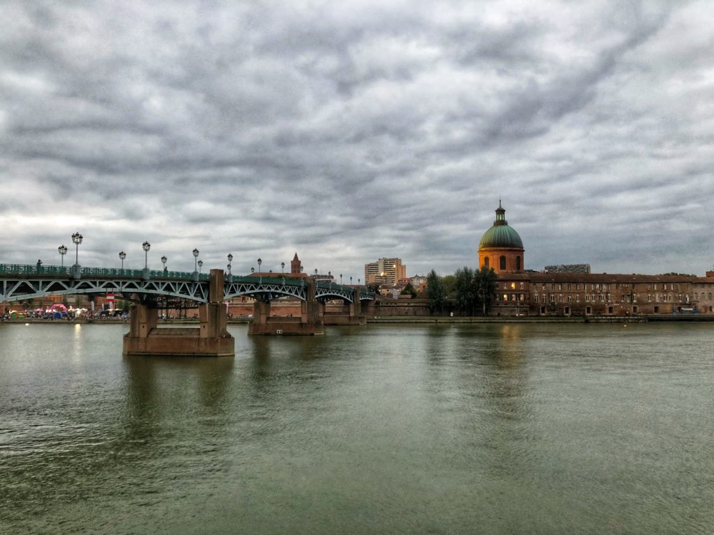I made my way back south and then west along Rue de Metz towards Pont Neuf (translates to “bridge nine”) and found….city bikes! I downloaded a handy app called “Velouse” (so clever! “bike” in French is “velo” so velo + Toulouse = Velouse). It acts the same way as the Bordeaux app so it just tells me my location and all the docking stations. Again, I was able to register at a dock station with my credit card for a 24 hour pass. I went across the city’s Pont Neuf to the other side and away from the city center. I just wanted to find out if it would be more suburban. I came across a park with views of Pont Neuf. The skies were pretty cloudy that day so by golden hour, there wasn’t much color.