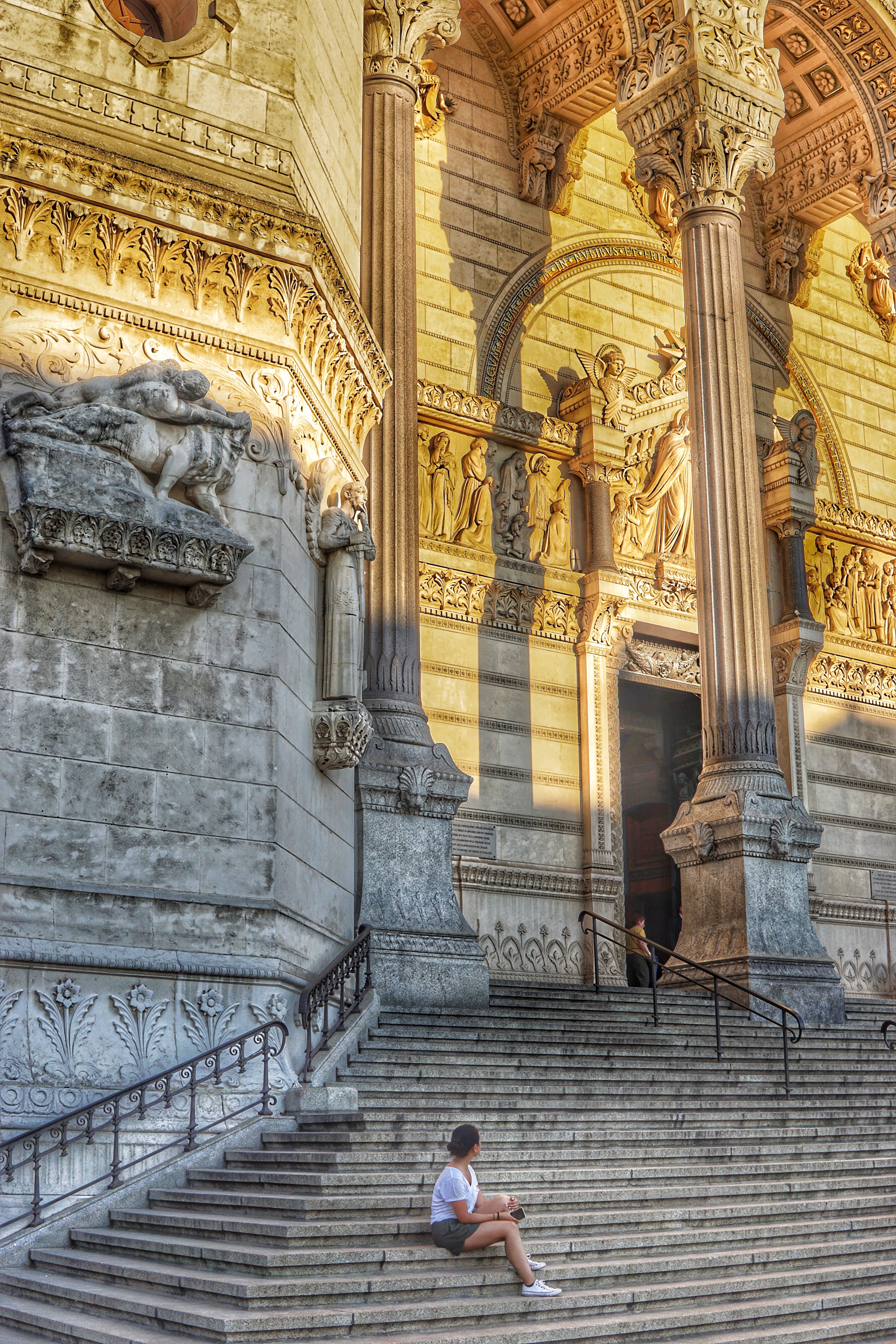 Just before sunset, we headed to La Basilisque Notre Dame de Fourvière, a church that overlooks the city. There are several options to get to the top, the most popular being a tram that connects to the city’s metro system. You can also drive up there if you own or rent a car. Or you can do what Erik and I did, which was walk. Hike was more likely it since it was basically straight uphill, then a ton of stairs, and more stairs.