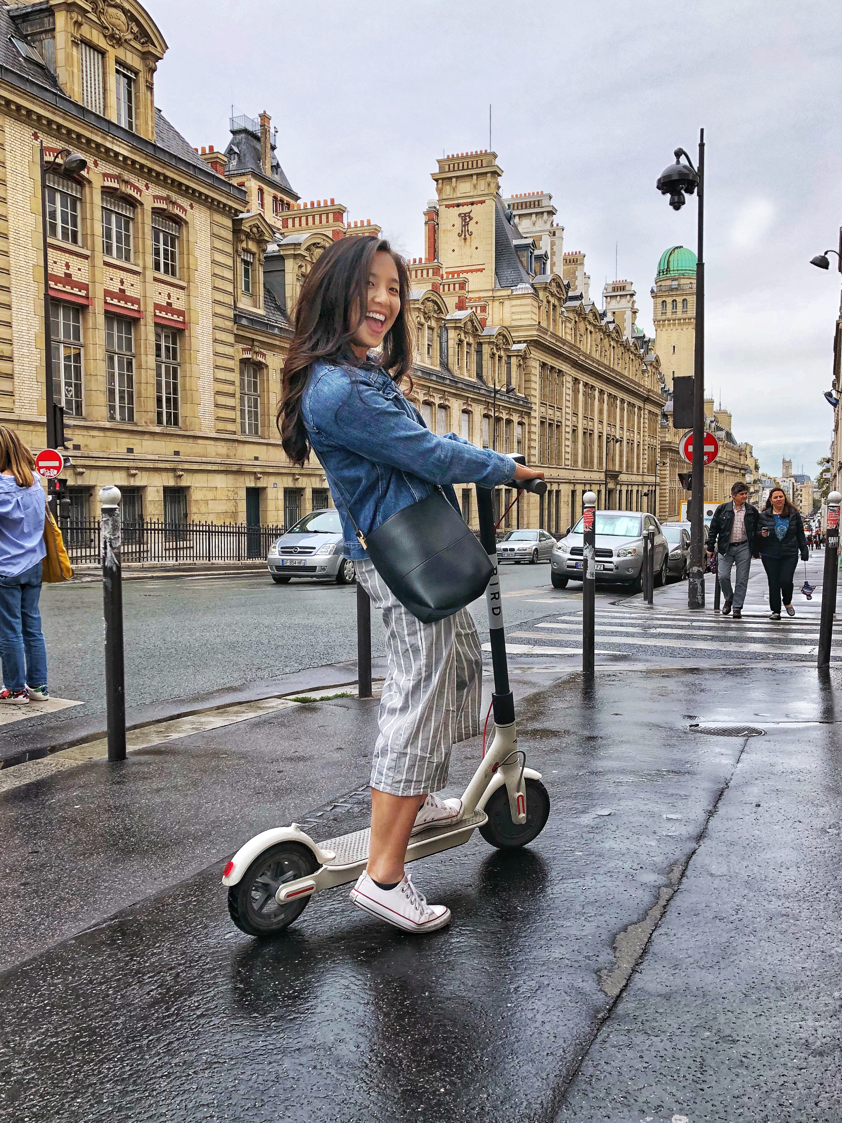 Right after this, we headed over to the direction of the Panthéon, just wandering around. Then it started to rain pretty heavily and so we took shelter at a cafe to wait it out since I didn’t have a hood on my denim jacket nor did I bring an umbrella. Once the rain let up a bit, we decided to ride our first Bird scooter in the city and made our way towards the center of Paris to check out the Notre Dame and exterior of the Louvre. As usual, there were tons of tourists around at both attractions, including a ton of pigeons outside the cathedral.