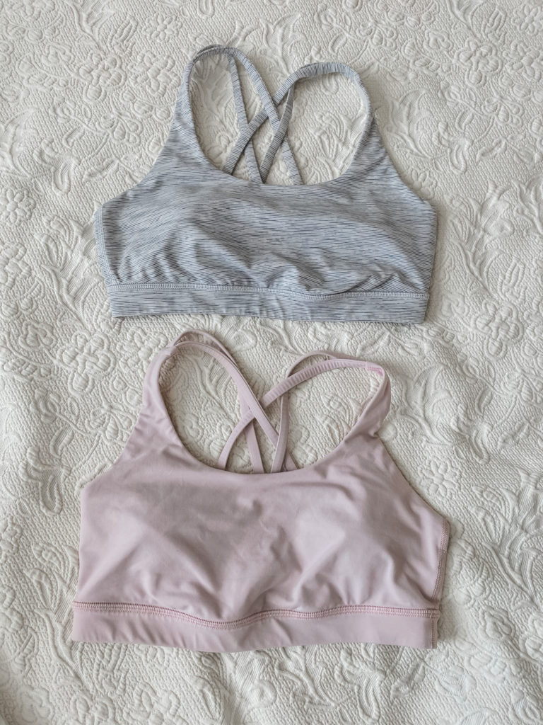 I only have 2 sports bras from Lululemon, and I got both from the sale section, which was lucky for me! They’re the same style, just different design and I wear these in size 8. I like the strappy design on the back, though they do flip over sometimes. I’ve had these for about a year or more and they’ve withstood countless machine washes pretty well.