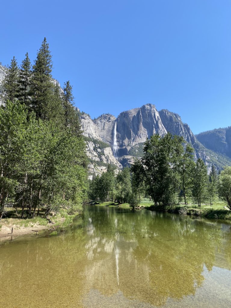 There’s a bike path that loops all through Yosemite Valley, which passes through the Swinging Bridge. Here is where you’ll get your first view of Yosemite Falls from the distance. The water here is crystal clear and you’ll find kids playing in the water and some hang gliders.