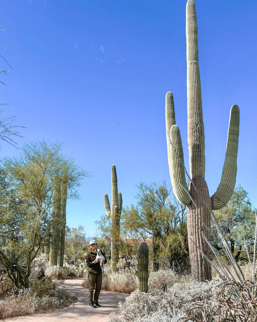 Saguaro (pronounced sah-wah-roh) National Park is actually broken into East and West with Tucson in between. The drive between the two visitors centers is just under an hour. If I had to pick just one to go to, I felt the East side had more viewpoints, dog friendly walks, and better landscape backdrop. Maddie enjoyed her time in the sunshine, but we were lucky to have cloudy skies. I can only imagine how brutal the sun can be during a clear day. If you bring your pup with you, be sure to check her paws! Maddie got some burrs underneath her paws that I had to dig out. Recommended attractions: Desert Discovery Trail (West), Mica View Dirt Road (East), Cactus Forest Loop Road (East).