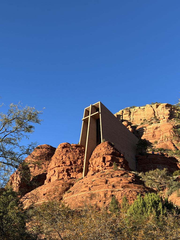 After the hike, we grabbed some Mexican food and headed over to the Tlaquepaque Arts and Crafts Village. This is a quaint area with a bunch of art galleries and artist shops. Everything here was a bit overpriced and definitely for wealthier people who collect art. Next up was visiting the Chapel of the Holy Cross, a famous church that’s built into the side of the rocky cliffs. There are great views of Sedona from the chapel.