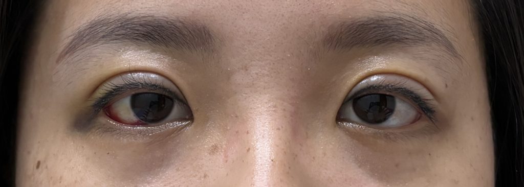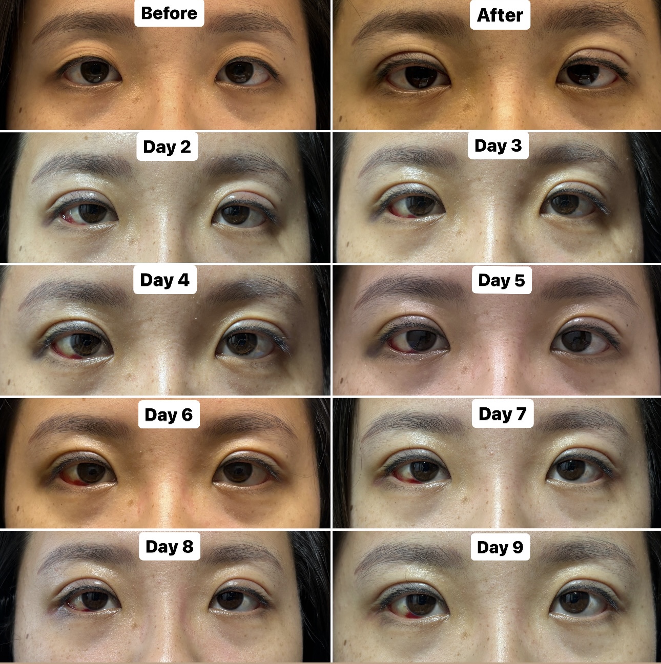 Within an hour after the procedure, the anesthesia wore off and I felt immense pain on my lids. I took the meds as instructed and began icing, which hurt to place anything on top of my lids. I’ve felt worse pain in the past (period cramps and also dry sockets from wisdom teeth removal), but this was pretty uncomfortable. Overnight though, the pain disappeared. The surgeon warned that the second day would look worse but my whole family thought I was actually better! The night of the procedure, I could hardly open my eyes since it felt better to keep the closed. During Day 2, I was able to keep my eyes open and also properly ice them every hour.