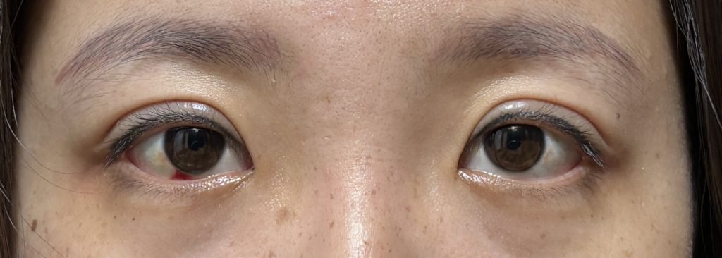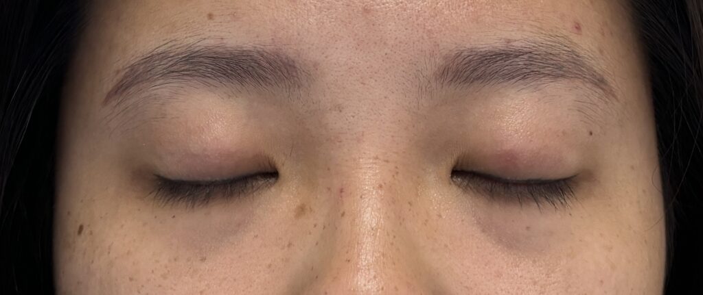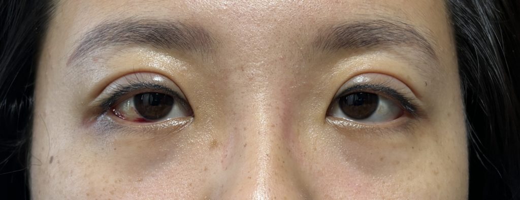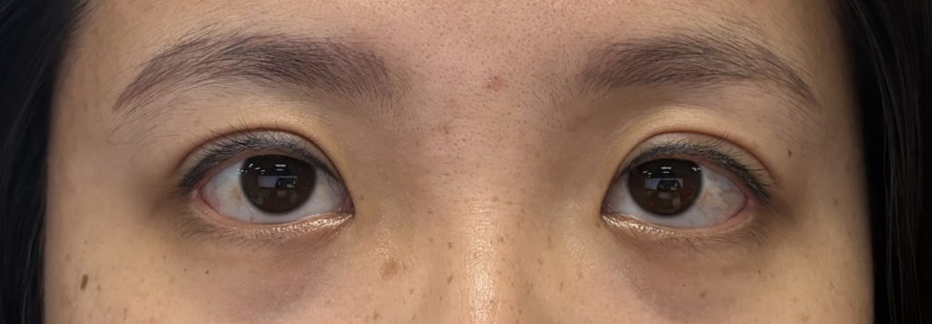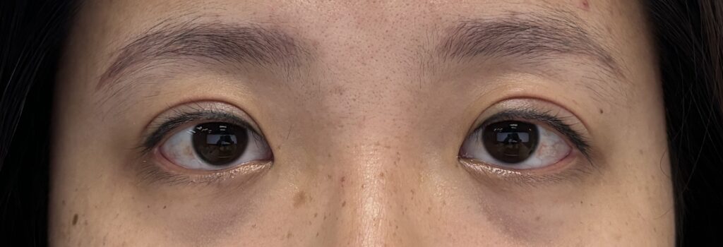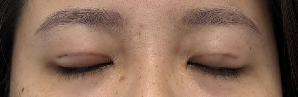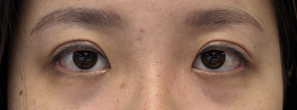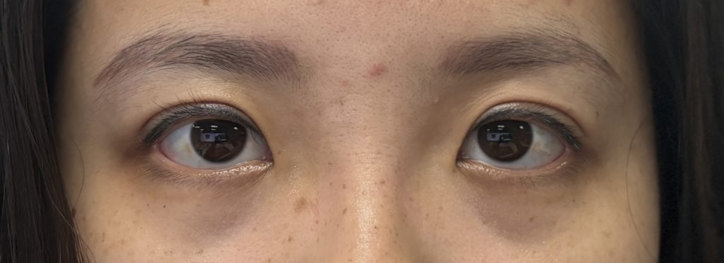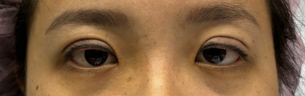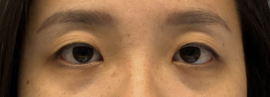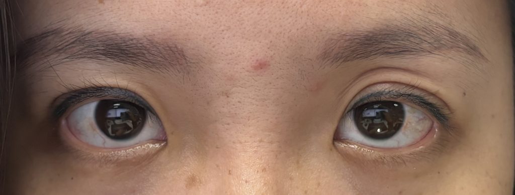 I sent this photo to my Aunt, who followed up with the surgeon/staff. If I glare slightly upwards, my left eye produces an extra line! I believe this is due to having a bit more excess skin on my left eyelid than my right, plus genetics. If I blink or look level, the extra line isn’t there. I’m not sure if my surgeon could have predicted this or stitched higher, but I just tell myself that eyes aren’t meant to be symmetrical and at least it’s just on one side!