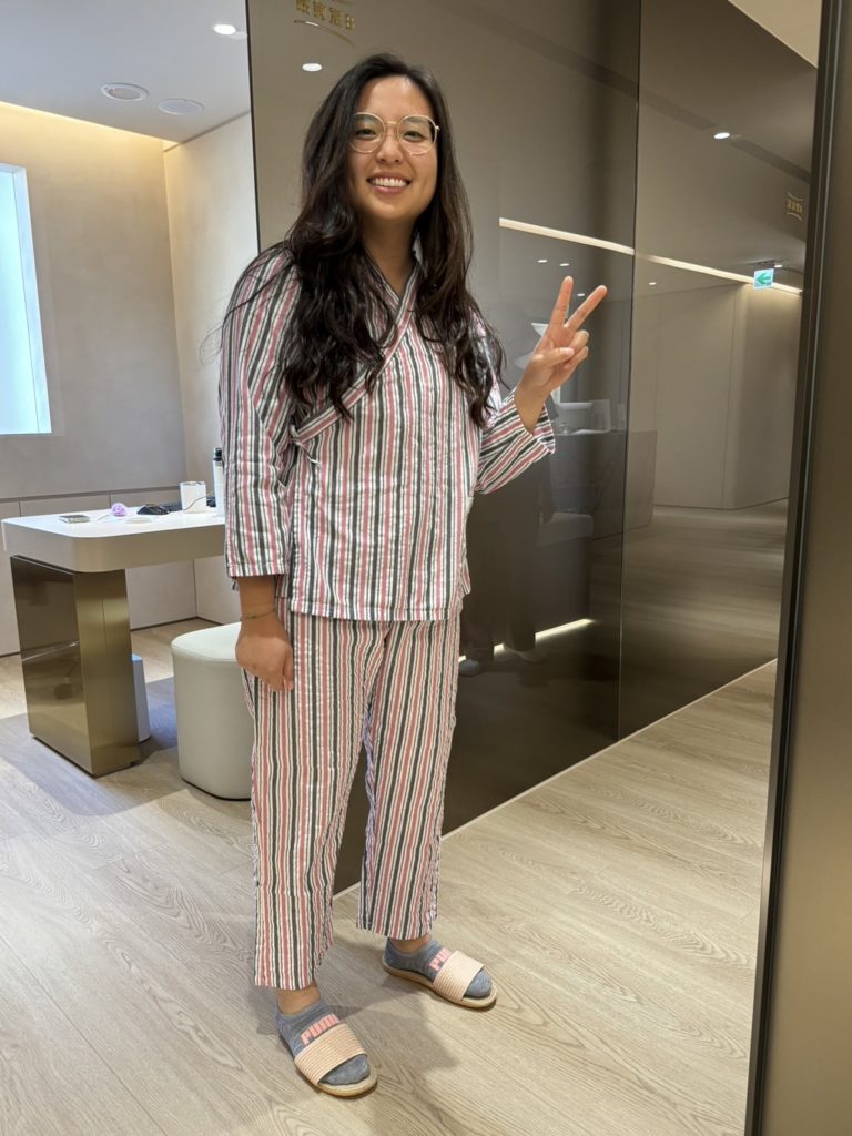 I arrived for my procedure and was at the office for about 2 hours total. This included signing release forms and going over aftercare, changing into surgery patient clothes, taking professional photos of the “before,” consulting with the surgeon on the shape of my double eyelids, and also post-op icing.